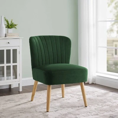 Add a touch of chic elegance to your space with this sleek and stylish Chelidon Velvet Slipper Chair from Threshold™ to dress up your living space. Crafted with a sturdy wood frame with clean lines, this velvet accent chair comes in a solid hue that blends seamlessly with any existing decor. The soft sheen of the velvet upholstery offers a rich, luxe appeal, while the channel stitching at back lends textural flair to any seating arrangement. Fashioned with a plush padded seat and a curved, angled back, this single-seater invites you to kick back and relax. Tapered wooden legs on this armless accent chair round off the design, offering a quaint mix of modern minimalism and mid-century charm, instantly elevating your indoor aesthetics.