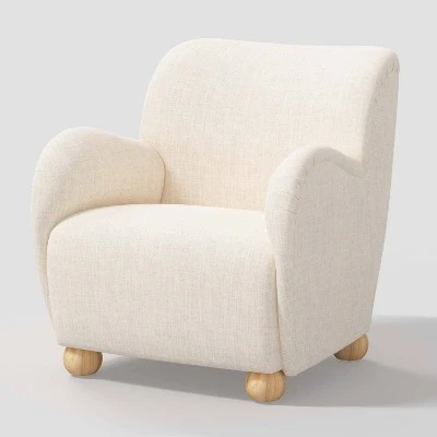 Switch up your home decor with this Rumi Armchair in Linen from Threshold™. This upholstered armchair chair features a modern appearance with a thick padded seat and backrest for comfortable sitting. Covered in solid-colored linen fabric, it blends seamlessly with the existing decor in your home, and the pinewood frame and round wooden legs offer sturdy support. Place it in your living room, bedroom or guest room to instantly elevate your decor.