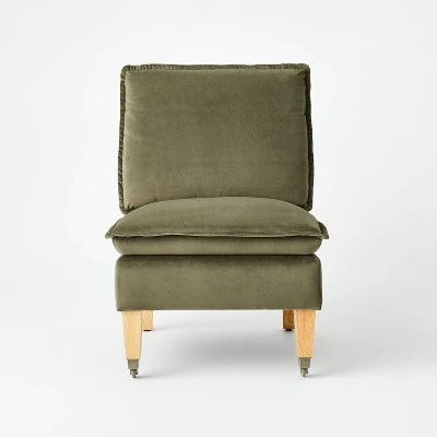 Create a stylish seating arrangement anywhere around your home with this Talbert Pillow Top Slipper Chair with Casters from Threshold™ designed with Studio McGee. Supported by a sleek wooden frame, this upholstered slipper chair features a pillow top seat and back for comfort and a stylish look that’s perfect to elevate the look of your space. Plus, the legs are fitted with casters that makes it easy to move from one place to another. Use this upholstered slipper chair to create a comfy reading nook or as an extra seating option anywhere around your home.